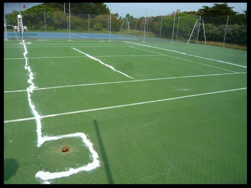 Si l’état du court le permet, des réparations peuvent être entreprises : scier le bitume autour des taupinettes ou les poncer, selon leur importance, pour extraire les racines ou libérer les gaz, reboucher les fissures, niveler les flaches au bouche pores, puis procéder à l’application des couches de résine, selon les besoins du court, on peut supprimer la couche de bouche pore et passer en 3 couches.